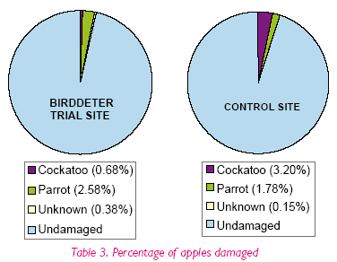 Discussion The yield of Pink Lady apples in the area protected by the BirdDeter system increased by a factor of 14 this year over last year. Such a large increase in yield could not be accounted for by yield doubling at the control site, or the age of the trees. The results show that the BirdDeter system was the major factor in achieving the yield increase. Parrots had already been feeding in the trial site orchard before the BirdDeter System was installed; there may have been less damage caused by parrots if the system was working before they had established a feeding habit. A Benefit Cost Analysis is currently being carried out.