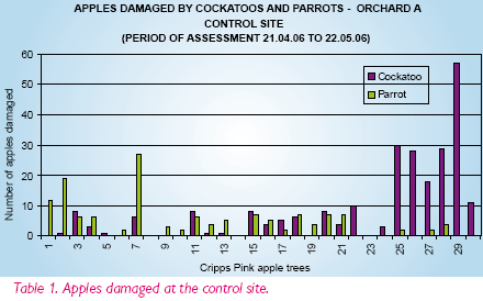The Warren Catchments Council ran a project, Black Cocky—Awareness & Threat Abatement in Southern Forests WA during the 2005–06 apples season. The project was sponsored by the Threatened Species Network Community Grants, CALM, WA Fruit Growers Association and equipment suppliers/ manufactures. As part of this project a bird repelling system was installed in an orchard south west of Manjimup, WA. This article is a report summary. The full report can be obtained from Lee Fontanini, Project Officer, Southern Forest Landcare, Warren Catchments Council, 52 Bath Street, Manjimup WA 6258.