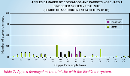 Discussion The yield of Pink Lady apples in the area protected by the BirdDeter system increased by a factor of 14 this year over last year. Such a large increase in yield could not be accounted for by yield doubling at the control site, or the age of the trees. The results show that the BirdDeter system was the major factor in achieving the yield increase. Parrots had already been feeding in the trial site orchard before the BirdDeter System was installed; there may have been less damage caused by parrots if the system was working before they had established a feeding habit. A Benefit Cost Analysis is currently being carried out.
